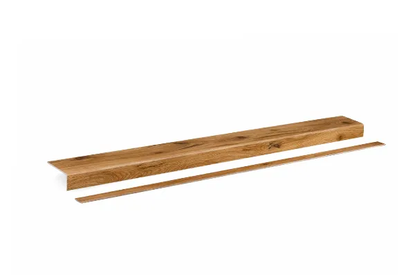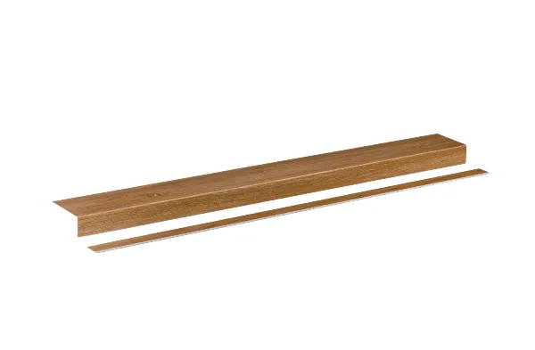 Stopnica, krawędź winylowa i panel bazowy w identycznym dekorze SPC RIGID. Konfigurator dobiera wszystkie elementy automatycznie.